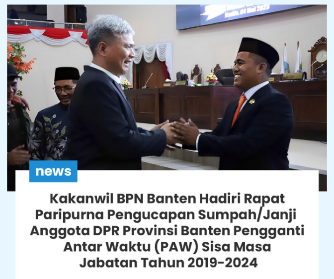 Serang ,(parlemenbanten.com)- Kepala Kantor Wilayah Badan Pertanahan Nasional (BPN) Provinsi Banten Rudi Rubijaya, melantik dan mengangkat sumpah/janji Pejabat Pengawas Eka Raharja sebagai Kepala Seksi Penetapan Hak dan Pendaftaran pada Kantor Pertanahan Kabupaten Lebak pada Rabu (3/5/2023).