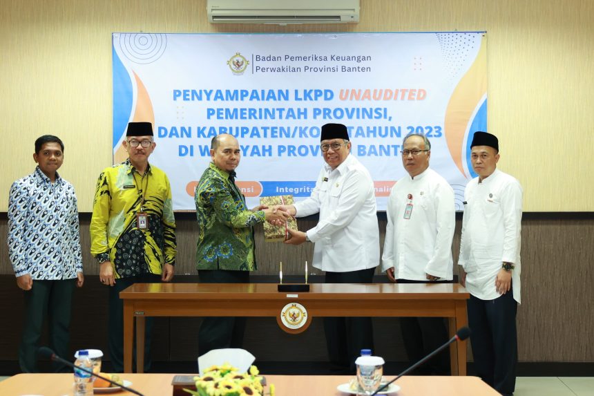 Serang (parlemenbanten.com) – Pemerintah Kota (Pemkot) Tangerang Selatan (Tangsel) menyerahkan Laporan Keuangan Pemerintah Daerah (LKPD) Unaudited Tahun 2023 kepada Badan Pemeriksa Keuangan (BPK) Republik Indonesia (RI) Perwakilan Provinsi Banten. LKPD tersebut diserahkan oleh Wali Kota Tangerang Selatan Benyamin Davnie kepada Kepala BPK Perwakilan Provinsi Banten, Dede Sukarjo di Kantor BPK Perwakilan Provinsi Banten, Serang, Jumat (08/03/2024).