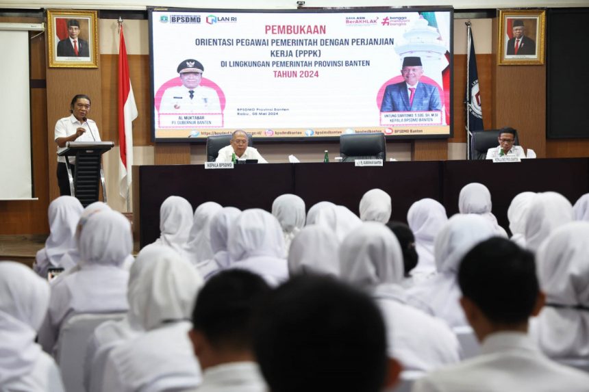 “Pemerintah Provinsi Banten menjalankan aturan supaya PPPK harus mendapatkan pembekalan orientasi kerja,” ungkap Al Muktabar usai Pembukaan Penilaian Etika Pegawai Pemerintah dengan Perjanjian Kerja (PPPK) di Lingkungan Provinsi Banten bertempat di Aula Badan Pengembangan Sumberdaya Manusia (BPSDM) Provinsi Banten, Jl. AMD Lintas Timur No.6 Kadumerak, Kecamatan Karang Tanjung Kabupaten Pandeglang, Rabu (8/5/2024).