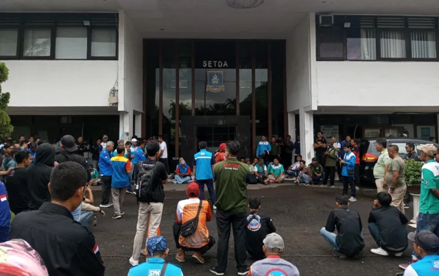Sebagai bentuk protes, ratusan buruh menggelar aksi di depan gedung Sekretariat Daerah (Setda) Pemerintah Kabupaten (Pemkab) Serang. Para buruh duduk di depan pintu masuk gedung, menyampaikan orasi secara bergantian dengan menggunakan pengeras suara.