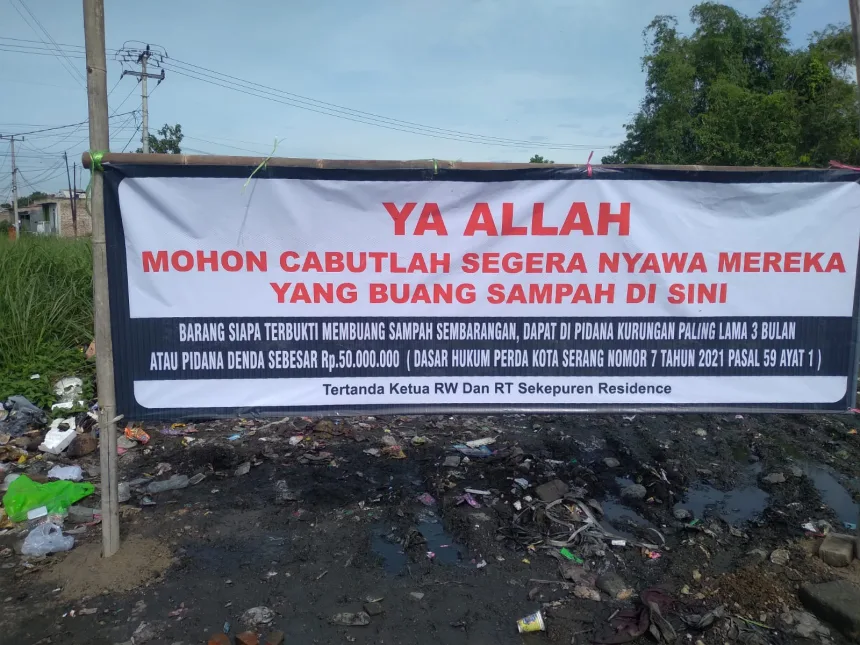 Tak hanya itu, peringatan hukum turut dicantumkan dengan dasar Perda Kota Serang Nomor 7 Tahun 2021 Pasal 59 Ayat 1. Bunyi pasal tersebut mengatur ancaman pidana kurungan paling lama 3 bulan atau denda hingga Rp 50 juta bagi pelaku pembuangan sampah sembarangan. Spanduk itu ditandatangani oleh Ketua RW dan RT setempat sebagai bentuk ketegasan pengelola lingkungan.