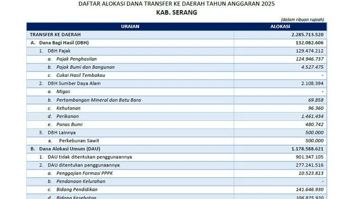 Inilah daftar lengkap dana transfer ke daerah 2025 Serang :