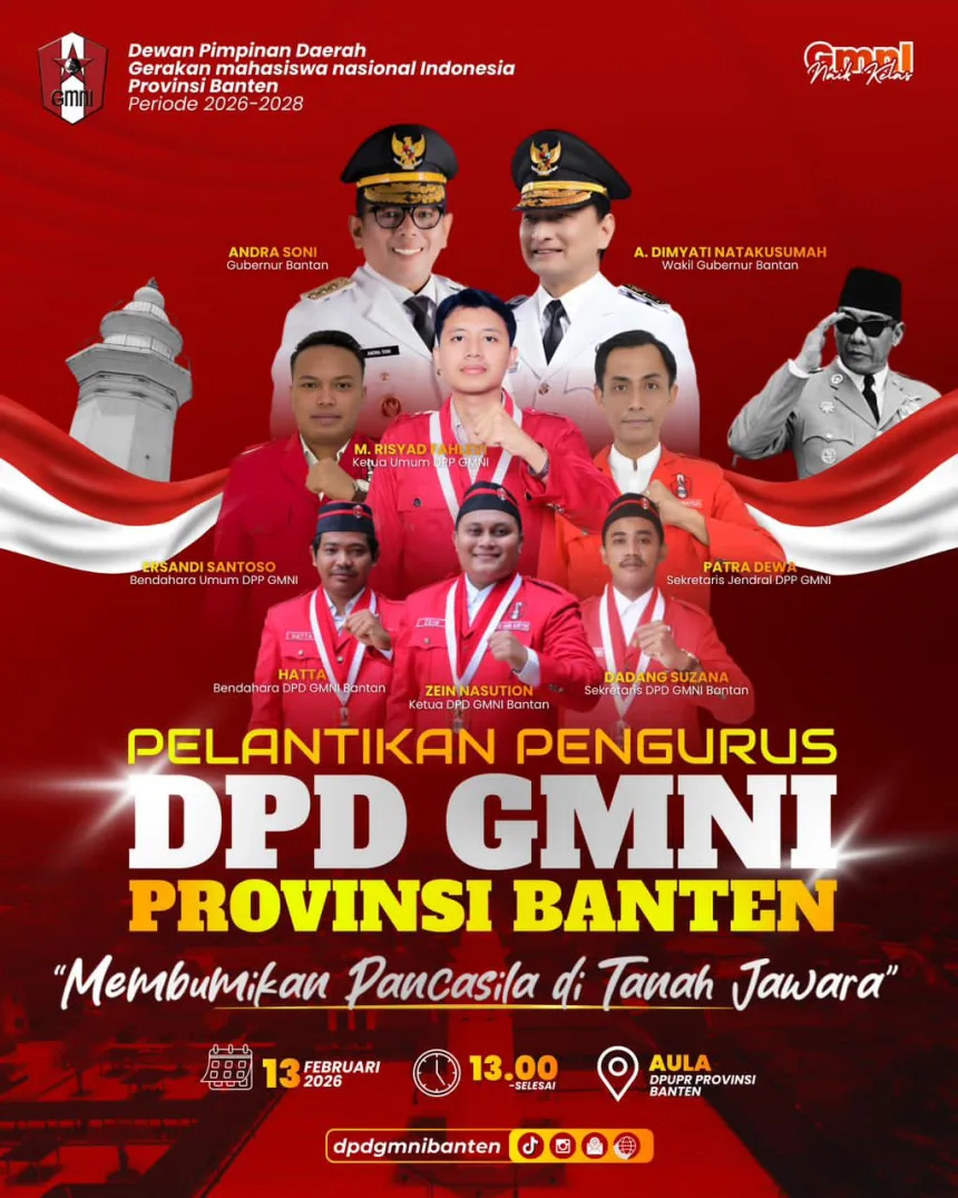 Tangerang Selatan (parlemenbanten.com) – Pelantikan Kepengurusan DPD GMNI Provinsi Banten dilaksanakan pada hari Jumat, 13 Februari 2026 di Aula Dinas PUPR Provinsi Banten.