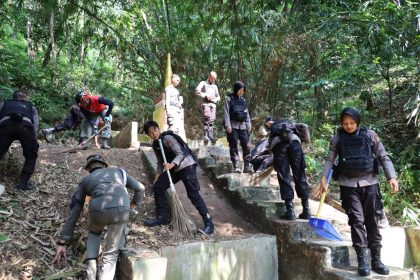 Jelang HUT RI-78, Polda Banten Beserta Rombongan Bersihkan Tugu Perjuangan Cijentul Kota Serang